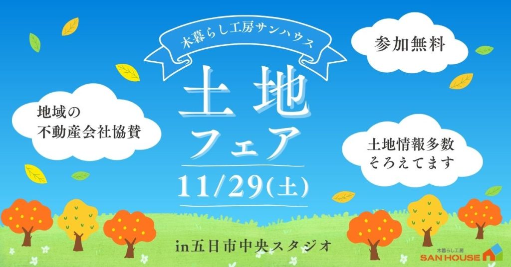 木暮らし工房サンハウスがお届けする「注文住宅用の住宅土地フェア」第2弾です。