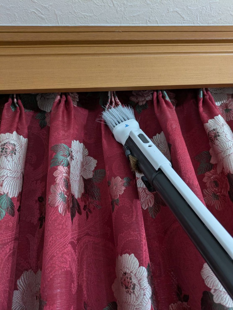 上用の毛ぼうきは、カーテンのヒダの部分って結構ホコリが溜まる箇所なので、ホコリが付いている部分にゆっくりあてて、ホコリを吸い取る時に使用しています。